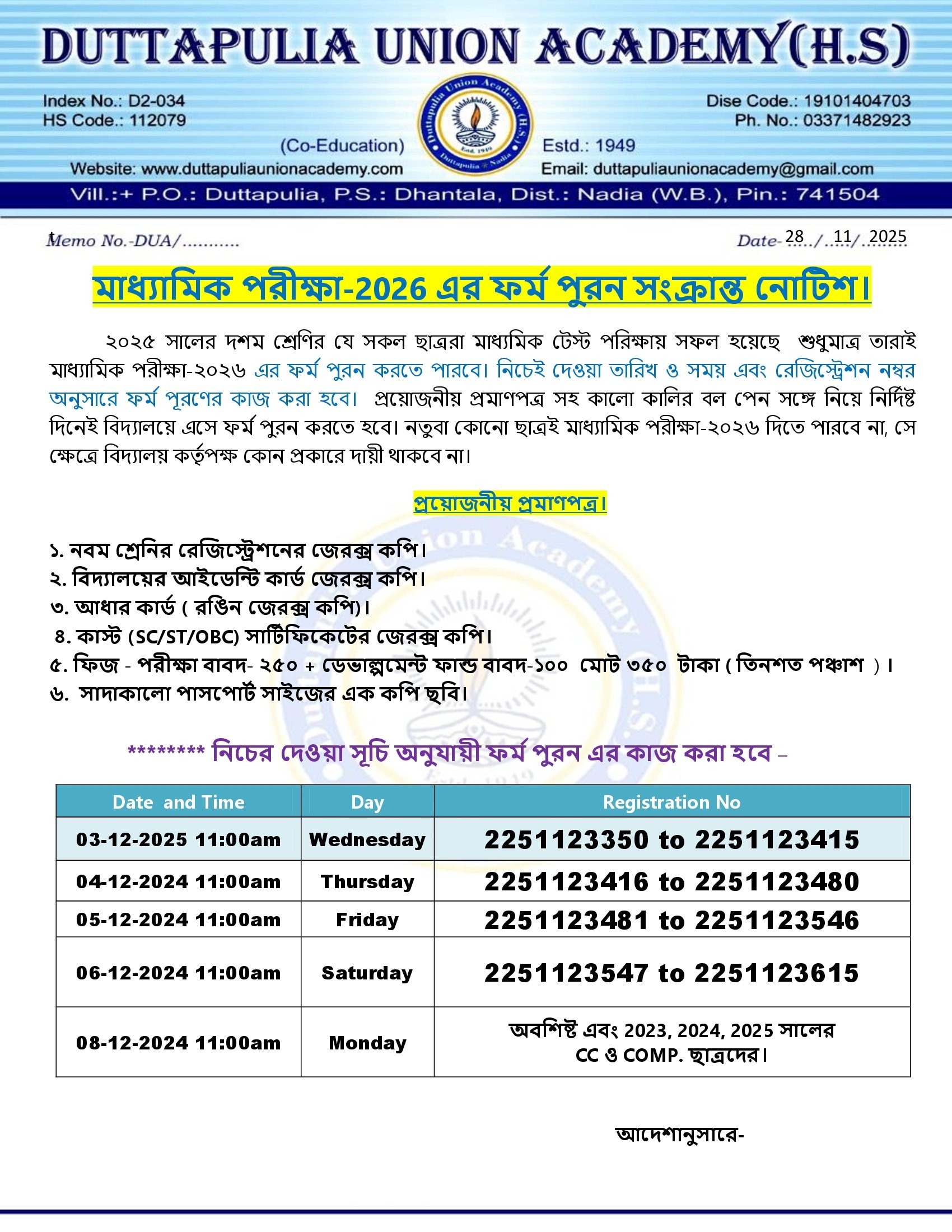 ২০২৫ সালের দশম শ্রেণির যে সকল ছাত্ররা মাধ্যমিক টেস্ট পরিক্ষায় সফল হয়েছে শুধুমাত্র তারাই মাধ্যামিক পরীক্ষা-২০২৬ এর ফর্ম পুরন করতে পারবে। নিচেই দেওয়া তারিখ ও সময় এবং রেজিস্ট্রেশন নম্বর অনুসারে ফর্ম পূরণের কাজ করা হবে। প্রয়োজনীয় প্রমাণপত্র সহ কালো কালির বল পেন সঙ্গে নিয়ে নির্দিষ্ট দিনেই বিদ্যালয়ে এসে ফর্ম পুরন করতে হবে। নতুবা কোনো ছাত্রই মাধ্যামিক পরীক্ষা-২০২৬ দিতে পারবে না, সে ক্ষেত্রে বিদ্যালয় কর্তৃপক্ষ কোন প্রকারে দায়ী থাকবে না।